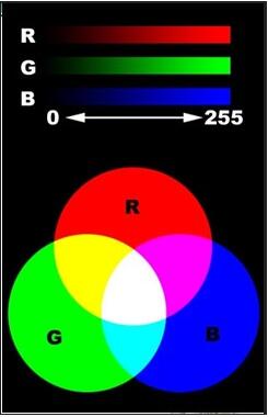 混色设定(加法混合):RGB是从颜色发光的原理来设计定的,通俗点说它的颜色混合方式就好象有红、绿、蓝三盏灯,当它们的光相互叠合的时候,色彩相混,而亮度却等于两者亮度之总和(两盏灯的亮度嘛!),越混合亮度越高,即加法混合。有色光可被无色光冲淡并变亮。如蓝色光与白光相遇,结果是产生更加明亮的浅蓝色光。知道它的混合原理后,在软件中设定颜色就容易理解了。红、绿、蓝三盏灯的叠加情况,中心三色最亮的叠加区为白色,加法混合的特点:越叠加越明亮。红、绿、蓝三个颜色通道每种色各分为255阶亮度,在0时“灯”最弱——是关掉的,而在255时“灯”最亮。当三色数值相同时为无色彩的灰度色,而三色都为255时为最亮的白色,都为0时为黑色。