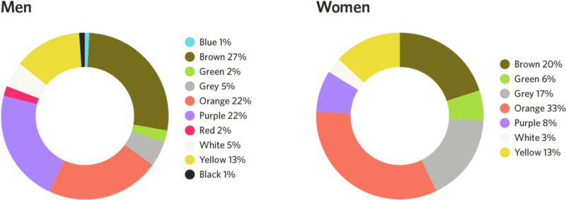 2、男性和女性都非常不喜欢棕色、橙色和黄色。灰色是女性最不喜欢的色彩之一,而紫色是男性最不喜欢的色彩之一。