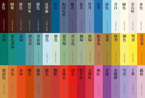 中国风配色卡,这些颜色都是从古代的文物上出现的经典配色取下来的。仔细一看,你会发现里面的名字都很有趣,你光听名字是猜不到它的颜色的。比如,“竹月”,这是什么颜色呢?它描述的是一种“竹林当中月色清冷”的感觉。也就是,淡淡的蓝色加了点紫。