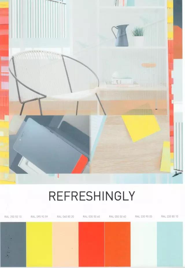 “清新宜人REFRESHING”这一趋势用冷暖对比的细微差异创造出新鲜现代的气息,呈现出清晰的图形风格。新趋势、新技术是这一青春风趋势背后的驱动因素之一。