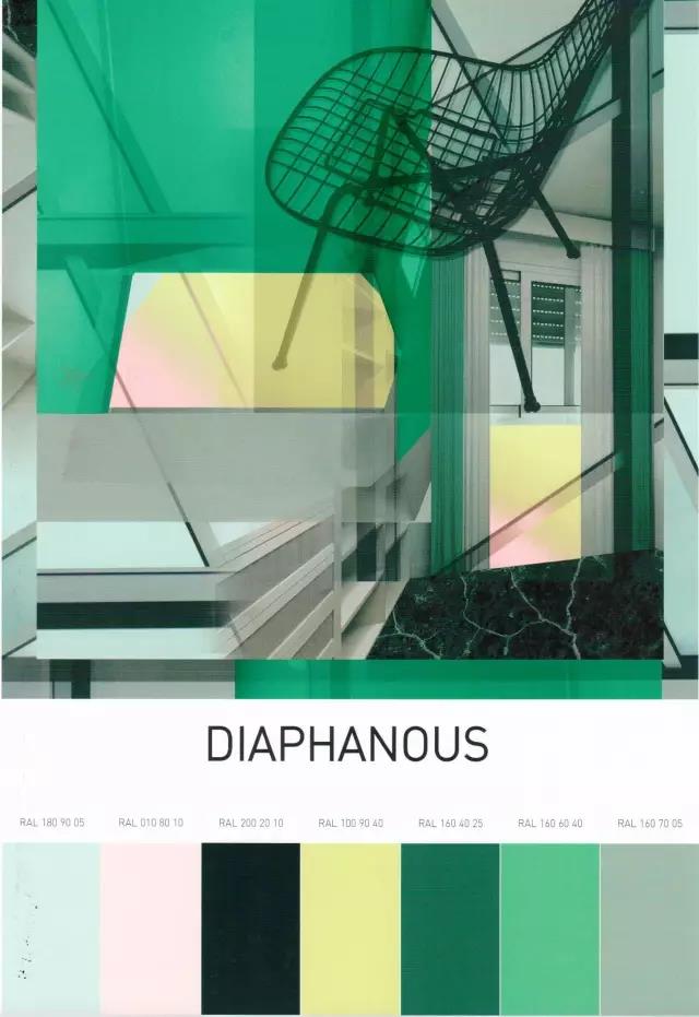 绿色是最后一个趋势“精致透明DIAPHANOUS”的基础色调,创造出冷静的技术氛围,反映出现代人对自然的渴求。