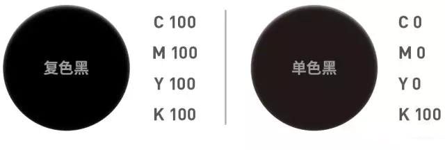 复色黑或称四色黑(rich black或jet black),是CMYK 四色叠印而成。为了让大面积黑色更加浓重或校正黑墨常常偏暖色调,通常会采用复色黑。CMY数值并不一定要设置到100,更加常用的办法是在K90—K100的情况下,添加少量的C(青色)来互补偏暖的黑色。这样也让套色难度变小。对于文本来说,基本需要选择单色黑。
