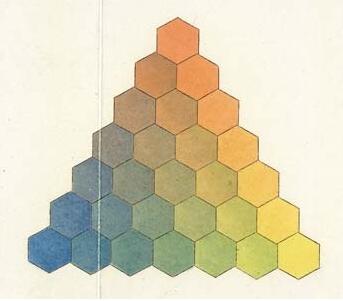 Mayer提出来的三原色理论:所有颜色由红黄蓝三种“原色”组成,分别占据三角形的三个顶点,改变他们的配比关系,可以产生混合的过渡色。过渡色可以按照跟原色的关系远近,分布在顶点之间的连线上。而Harris的色环里已经有了浅颜色,但是深颜色还没有。肿么办,纸面有限,已经放不下那么多深颜色了。。。于是乎,就有了德国科学家Johann Heinrich Lambert的三维色彩金字塔: