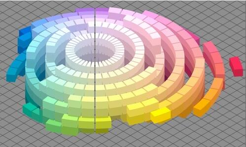 Munsell色空间的模型是在坚实的实验数据基础上完成的,这是Munsell体系经久不衰的重要基础,可以看到,Munsell色空间里有局部地方会突出一块,表示这里放了一个额外的颜色,另一些地方凹进去一些,表示这里木有颜色可放了,空着。