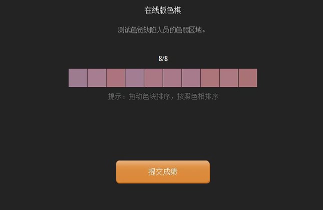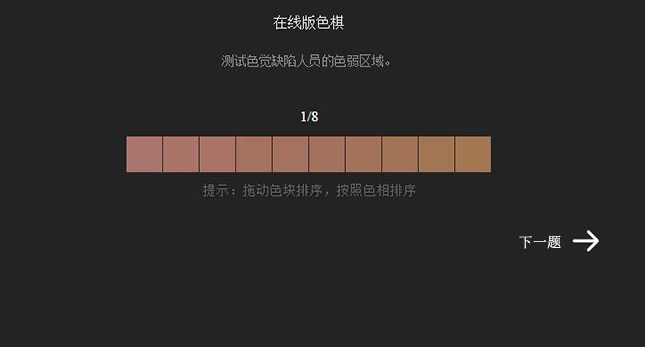 色彩是复杂多样的,人的辩色能力也分高、中、低三个层次,自己的辩色能力在哪个层次检测了才会知道,在这里分享一个色彩游戏---在线版色棋,可以测试人的色觉缺陷并指出在哪个色相上出现缺陷。
