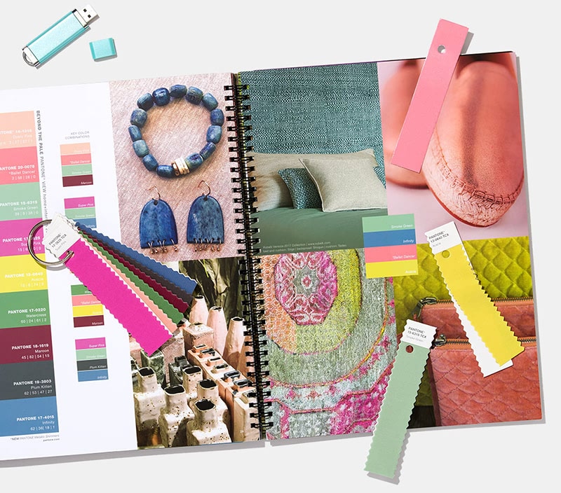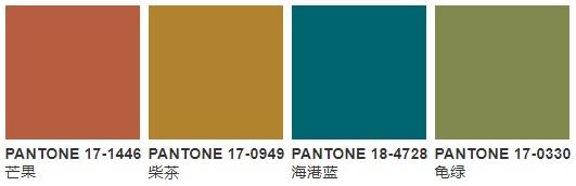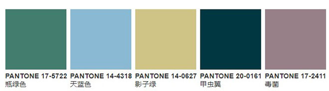 (PANTONE 17-5722 瓶绿色、PANTONE 14-4318 天蓝色、PANTONE 14-0627 影子绿、PANTONE 20-0161 甲虫翼、PANTONE 17-2411毒菌、PANTONE 17-1446 芒果、PANTONE 17-0949 柴茶、PANTONE 18-4728 海港蓝、PANTONE 17-0330 龟绿)