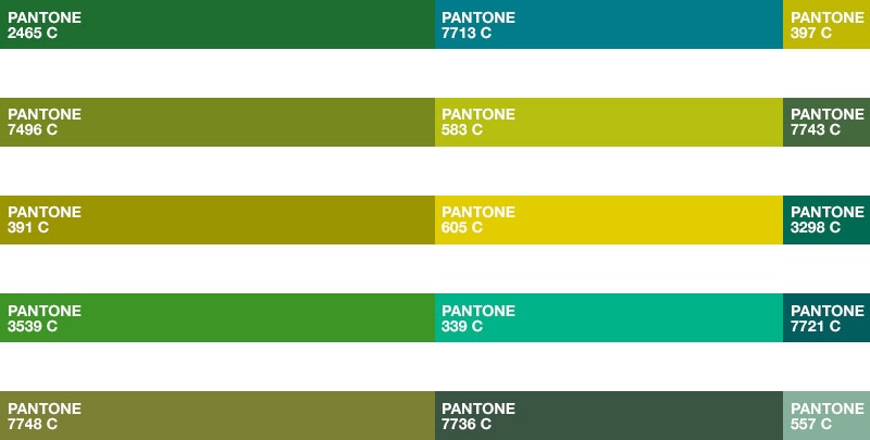 绿色调色板的需要证明了人类与绿色植物之间不可避免的、肯定生命的联系,提供关键的食物、水、氧气和补救措施。整体和谐的生活与黄绿色、蓝绿色和绿黄色的功效有关。饮食潮流、生活方式和幸福感都与这个色彩家族密切相关。它是最大的所有色调组,从最轻微的霜冻和海雾到最深的常绿植物;从阳光充足的石灰和明亮的查特莱斯到深郁郁葱葱的苔藓绿色;从多汁芦荟到甜豌豆。蓝绿色给蜜露和凤头鹦鹉带来了绿松石和深青色的绿色家族的又一个广泛延伸。