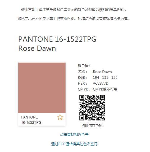 一:潘通PANTONE 16-1522(Rose Dawn),“一种柔和舒适的或柔和微妙的或温暖而亲切的粉尘土飞扬的颜色”;