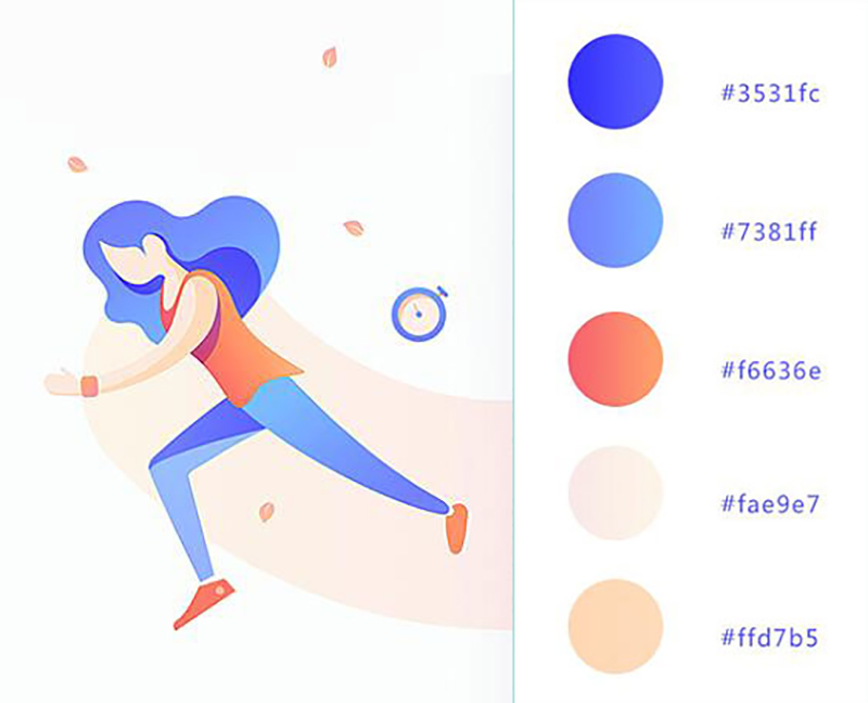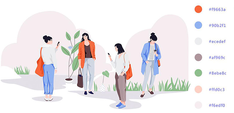 该插画采用冷暖2种配色,其中每个颜色又演化出同一色相的深浅不同颜色,既有层次感又丰富了画面,自己做插画设计时,可以先把造型确定,选出主色调,然后再把颜色细分,这样整组插画风格与色调非常的统一。