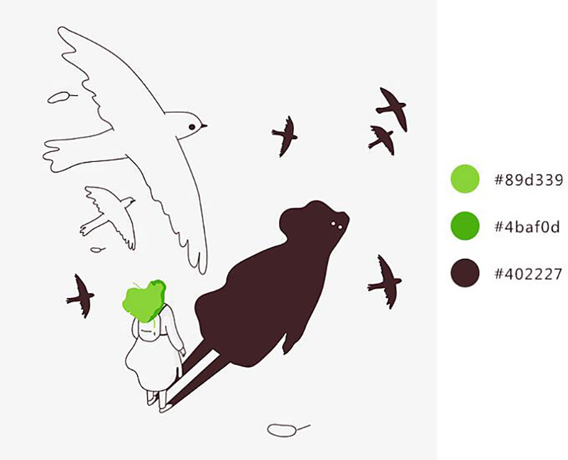 该插画采用2种色相配色,画面清新、简洁,作品中大量的留白,使得画面增添了不少趣味。