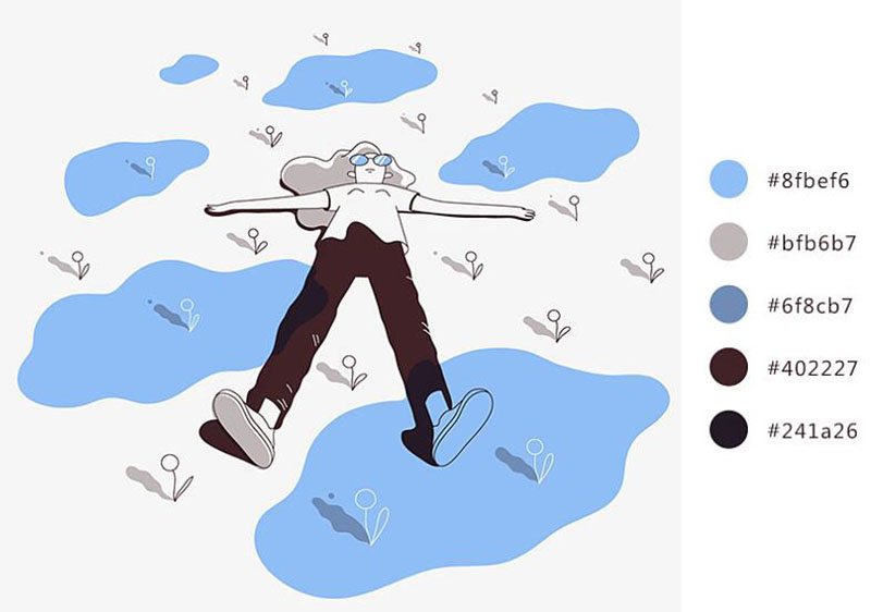 学习插画配色,需先了解配色比例,日本一位设计师曾提过一个配色黄金比例:70:25:5,70%为大面积使用的主色,25%为辅助色,5%为点缀色。一般情况下建议画面色彩不超过3种,3种是指的3种色相,诸如深红和暗红可视为一种色相。