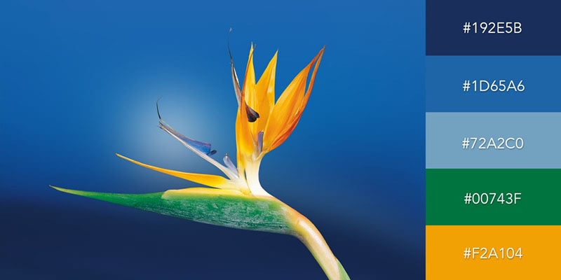 第六组:观察大自然久了,在蓝蓝的天空下,你会发现许多花花草草的色彩均能与蓝色搭配得很好看,譬如:蓝色搭配深青色和鲜艳的橙色,画面完美呈现出色彩鲜艳,充满活力的一面。在设计项目中,你可以选择最适合你想表达的设计颜色,例如可以考虑顶部的深蓝色和橙色作为核心色彩。