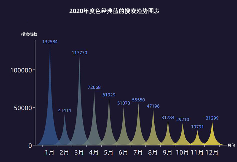 从图表可以看出,2020年度色彩经典蓝(Classic Blue)表现似乎平平。经典蓝(Classic Blue)作为年度色是2019年12月中旬PANTONE彩通公布的,公布后它的搜索人气有逐步上升,直至2020年1月份出现了峰值,接着似乎后劲有些不足,下半年明显有下降趋势。