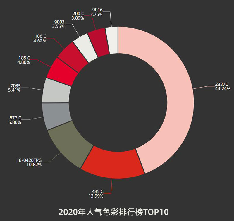 报告显示,2020年人气色彩排行TOP10的色彩号分别是:2337C、485C、18-0426TPG、877C、7035、185C、186C、9003、200C、9016;从视觉看,有彩色系占比82.4%,当中以粉色(占比44.2%)为主旋律,紧跟着的红色(占比13.9%)及绿色(10.8%)也取得了不错的成绩,剩下的多为无彩色系,约占比17.6%;