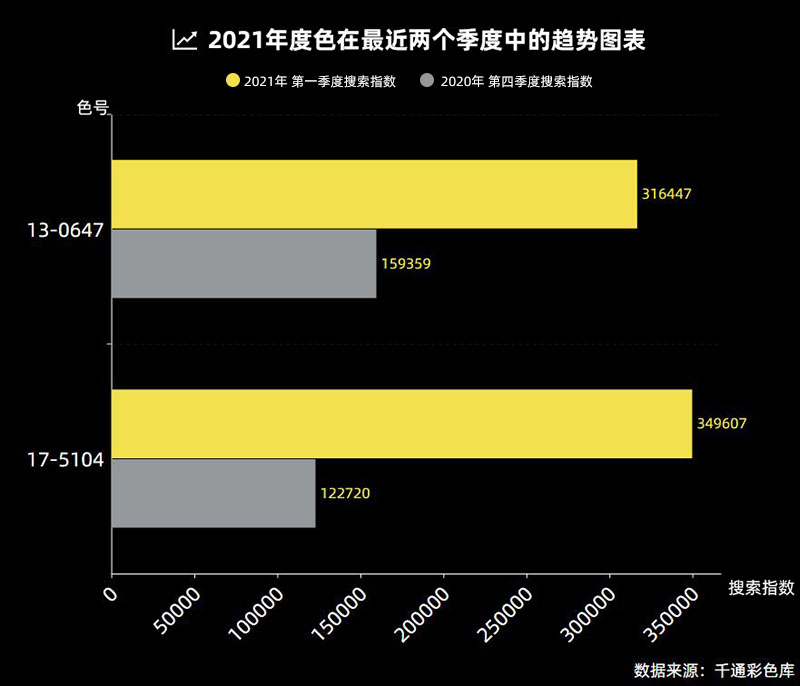 报告显示,纺织家居色彩排行首位的是色号17-5104,紧接着是色号13-0647,作为PANTONE彩通2021年的年度色彩极致灰+亮丽黄在本季中有了非常出色的表现。