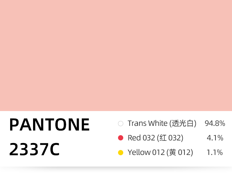 还有常见的PANTONE色号2337C,配方比例参考是由94.8%的PANTONE Trans White(透光白)、4.1%的Red 032(红 032)以及1.1%的Yellow 012(黄 012)混合而成。