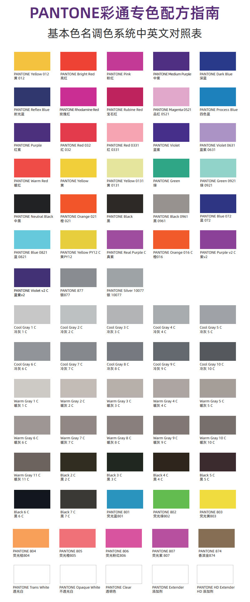 为了方便大家将PANTONE基本色一览无余,小千特意整理了这一份彩通专色配方指南——基本色名调色系统中英文对照表共享给大家,其中包含了33种基本色(含金属色&霓虹色),以及35种常见的调和效果色。