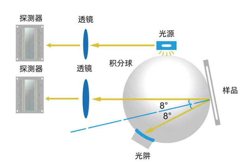 分光测色仪的观察方式一般被分为“0/45度”和“d/8度积分球”两种测量,其中“0/45度”多是只用来测量平滑物体表面,而且不能连接电脑配色,“0/45度”通常是便携式分光测色仪使用的观察方式,而“d/8度积分球”除了可以测量物体表面的色差之外,还可以连接电脑配色,其功能更加强大,并且测量结果更加稳定精确。