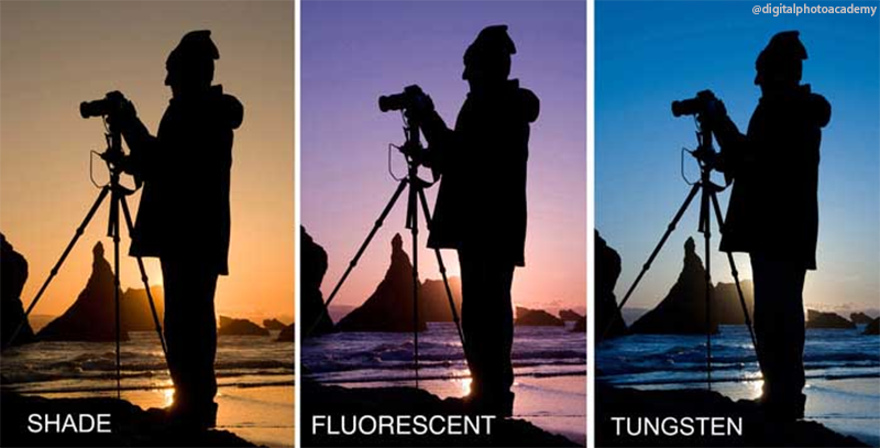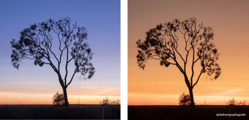 要创建色调较暖的图像(右侧照片),请选择阴天或阴影白平衡。无论哪种设置都会使您的场景或肖像看起来更温暖。或者更好的是,了解如何更好地利用相机的开尔文白平衡设置。大于 5000K 将产生更温暖的橙色光。低于 5000K 会给图像带来更蓝、更冷的感觉。我们强烈建议您在日出或日落时将相机放在三脚架上,并在最极端的情况下尝试开尔文白平衡。这是自己学习色彩概念艺术的最佳方式。当谈到色调时,你可以在相机中发挥出惊人的创造力。如果您没有开尔文设置,另一个选择是以RAW 文件格式拍摄并在 RAW 文件编辑器中更改色温。这将产生与在相机中执行相同的结果。