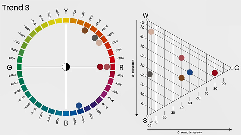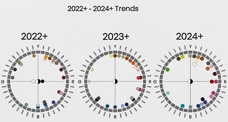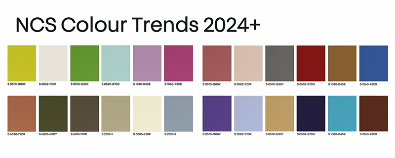 而当我们回顾2022年~2024年的NCS色彩趋势时,不难发现它们正在以非常明确的方式向更加清晰、深邃的方向发展。中间色调已经不再是主流,取而代之的是更加鲜明、强烈的色彩。