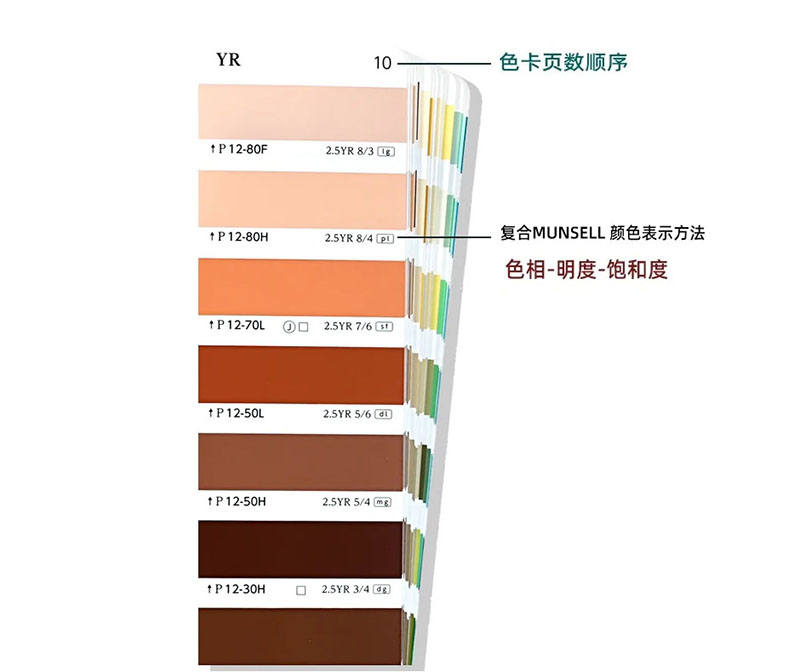 Munsell颜色色彩体系,也被称为蒙塞尔色彩体系,是由美国画家、美术教师阿尔伯特·H·芒塞尔在1900年左右确立的。该体系以五个基本色——红(R)、黄(Y)、绿(G)、蓝(B)、紫(P),以及五个中间色——黄红(YR)、黄绿(YG)、蓝绿(BG)、蓝紫(BP)、红紫(RP)作为基准。每种色相再细分为四种颜色,用数字2.5、5、7.5、10来表示,从而精确表达色彩的色相,而2024年P版JPMA色卡色号呈现复合munsell颜色表示方法,色彩分类清晰,可以快速找到所需色号,适用于各种应用场景。