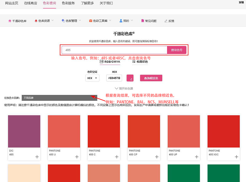 1、例如:输入色号185或者485C,点击色号查询,在Pantone色彩系统中包含485色号的色彩有多个,根据结果选择你需要的色号,点击该色号查询相关色值,当然了,你也可以根据结果选择不同品牌的相近色,譬如:Pantone、RAL、NCS、MUNSELL等品牌,如下图: