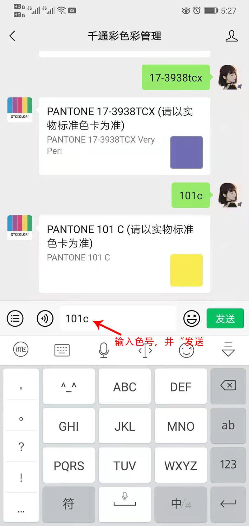 1、手机打开官方微信号,在输入框输入色号,并“发送”,输入格式(例如:17-3938TPG、485C、101C、180、1520、180C、2347C、11-0601、11-0601TCX、11-0601TPG等),如下图: