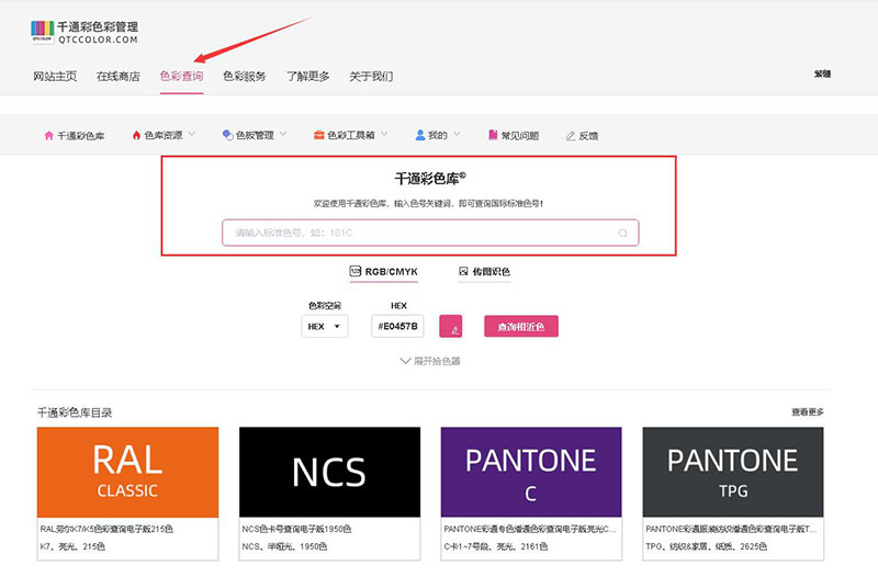 1.2、找到网站导航栏中找到“raybet最新版下载”栏目,点击进入千通彩色库-Pantone(潘通)色号查询系统,如下图: