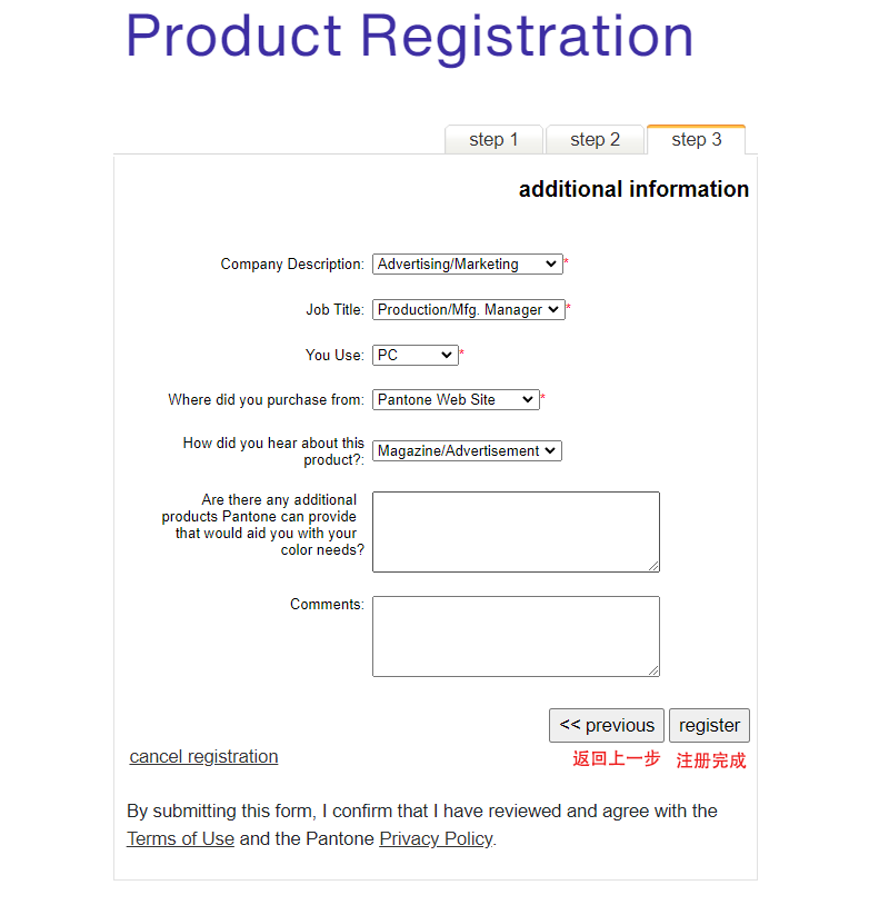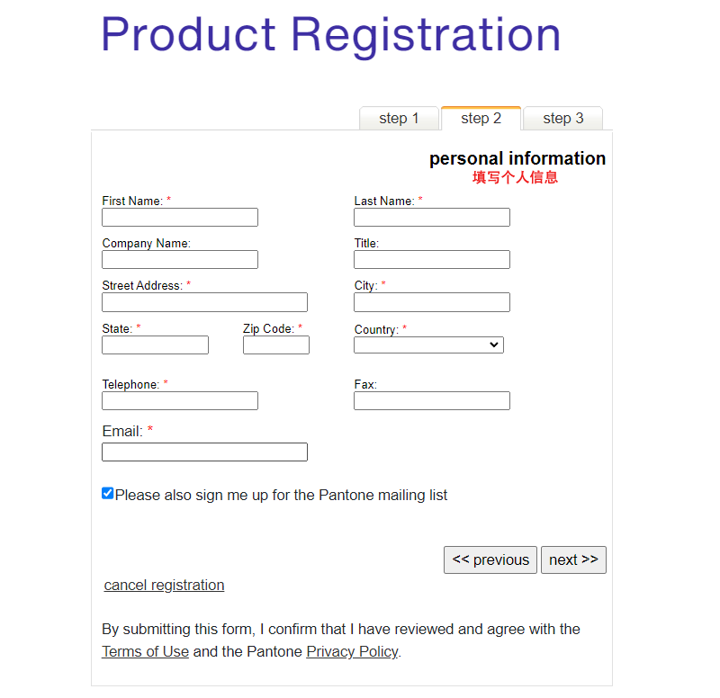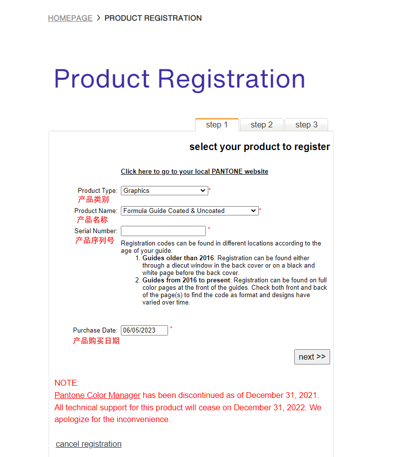 1.1  点击注册网址:https://www.pantone.com/customer-service/product-registration,根据提示填写产品类别、产品名称、产品序列号及购买日期(产品类别、产品名可在产品封面查看,产品序列号可在第一页全彩页中找到),填写完成后点击下一步;