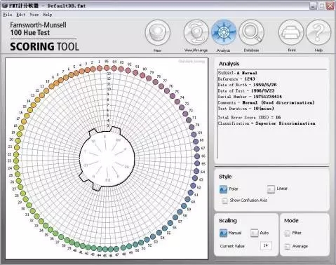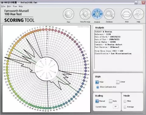 3. 评分系统(Farnsworth Munsell 100 Hue Scoring System)为一个光盘,内有计分软件;可安装在电脑中,用于最后计分、保存测试记录和出具测试报告;