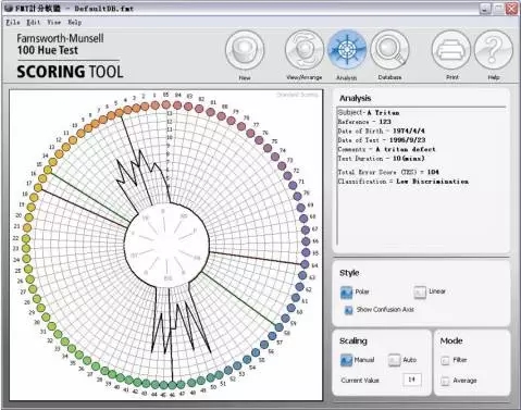 7. 评分:a.打开软件FM100Hue.exe;b 盖上每个塑料盒子的透明盖子,再倒向打开盒子,按照棋子的实际顺序,在评分软件中,调整软件中棋子的顺序;依次完成4 盒棋子的顺序记录;c 填写被测试人姓名,年龄,工作年限,测试时间,职业类型,批注等点击保存(save);然后点击“分析”(Analysis)则右侧可以看到其错误分数;