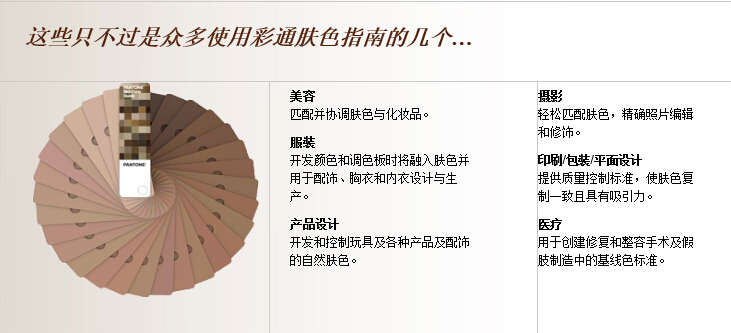 掌握人体肤色到底有多重要呢?举个常见的例子,彩妆师,众所周知这个职业生来便是与人体五官打交道,如何给皮肤上色、打好底色,什么样的肤色配什么样的眼影色彩和唇彩,都是需要他们以专业的眼光去思考和打量的。但专业的彩妆师不可能到现场面对真实的人脸时才去配色,因为一旦色彩搭配失败便需要全部重来。如何去解决这个问题呢?对于彩妆来说,有一副灵药可以让他们提前联系和掌握不同肤色下的合理搭配,并能让他们第一时间把握要化妆者的肤色种类,那便是人体肤色色卡。彩妆师可以根据肤色色卡提供的精确的肤色色号来提前地自由搭配和联系,而到现场他们仅需拿色卡比对被化妆者的肌肤便可确定色号和具体颜色,如此一来他们可根据色卡在平时进行精准的配色,而到现场他们便能游刃有余,大大提高了工作效率,这就是为什么一直以来PANTONE人体肤色色卡深受化妆品,时尚以及摄影,产品设计,医疗,印刷包装等行业的欢迎。