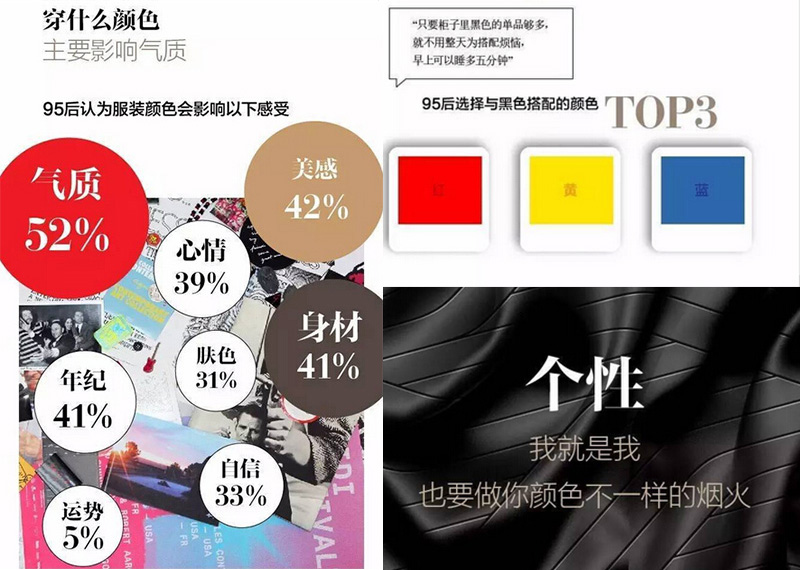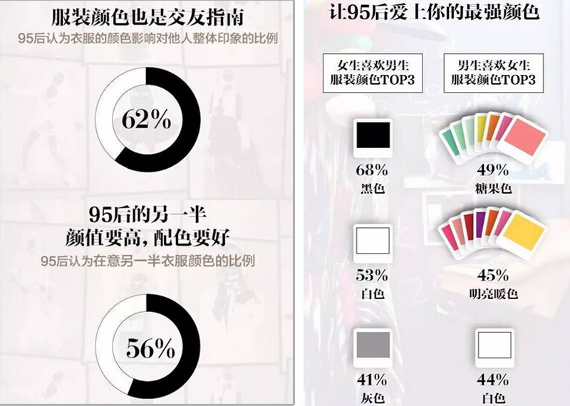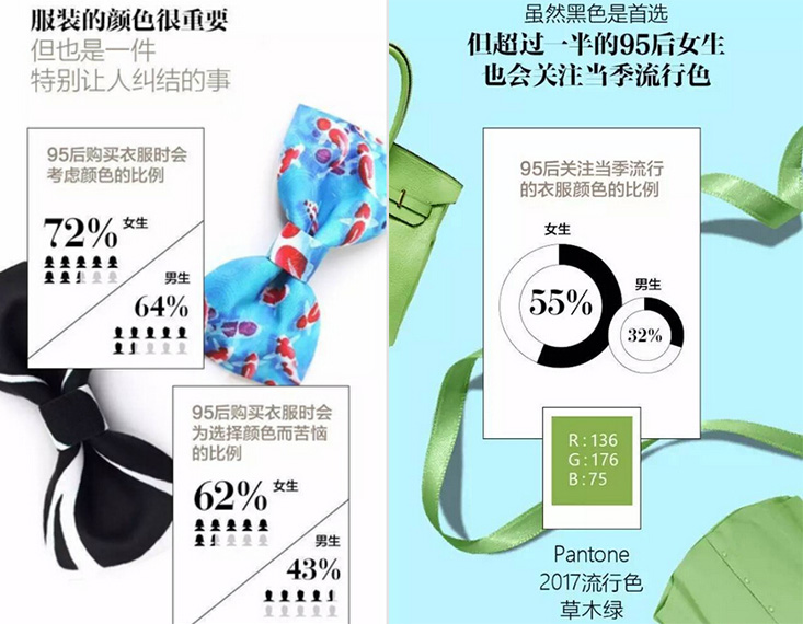 虽然黑色是95后男生女生买衣服首选,但仍然还有约50%的女生会关注当季的流行色,例如今年潘通发布的草木绿,一种清新又充满生机的颜色;