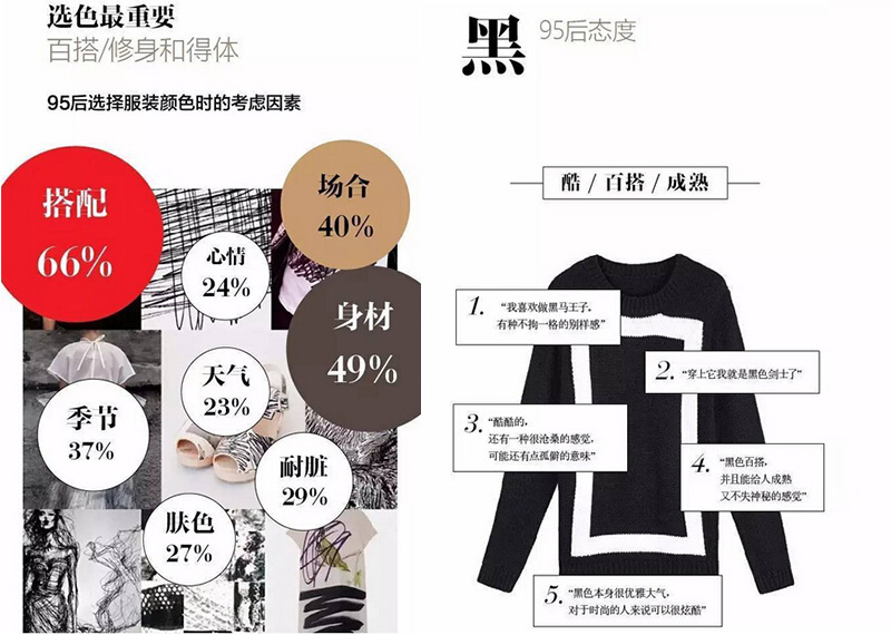 此外报告显示,在穿衣方面,95后认为服装颜色非常重要,在购买服装上,最重要考虑因素为颜色“搭配”,最常选择与黑色搭配的颜色是“红、黄、蓝”。他们认为颜色不仅会影响自己的气质、身材和心情,甚至是其交友和择偶的标准之一。因此,大多数95后男生一年四季都是“黑白配”的套路,95后女生则会通过四季变换和场合不同选择应景的颜色搭配服装。最为巧合的是,95后的男女最爱买的服装单品都是黑色T恤。