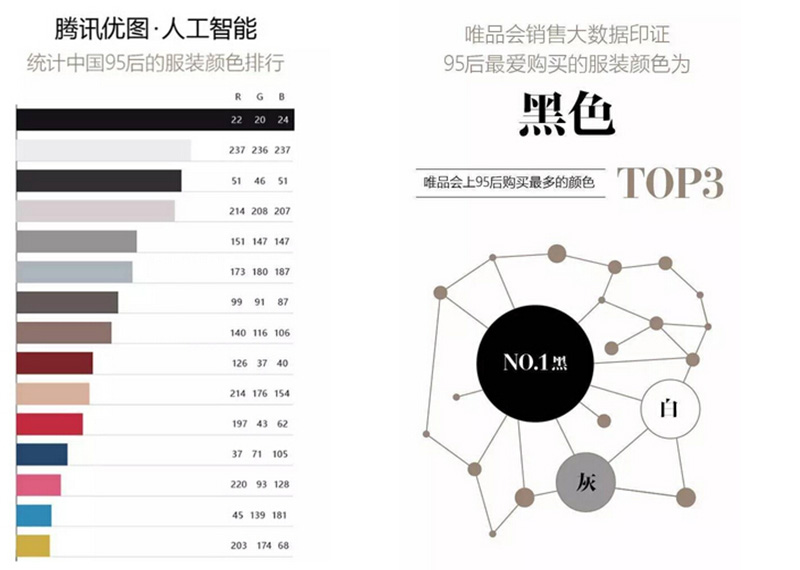 腾讯人工智能团队“腾讯优图”借助 AI人脸识别与图像处理技术,分析了2016年整年 QQ 空间相册中千亿公开照片,结合电商平台提供的“95后服装销售大数据”,完成了一份不同寻常的数据报告,首次揭晓中国95后年轻人最喜欢的流行颜色是RGB值为22/20/24的“不饱和黑色”,并将其命名为“95度黑”。