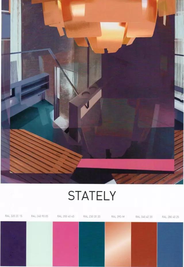 “庄重高贵STATELY”这一强调优雅设计理念的趋势关注清晰形状与奢华表面相的结合。这一组趋势色强调了简朴与品质的相互作用。
