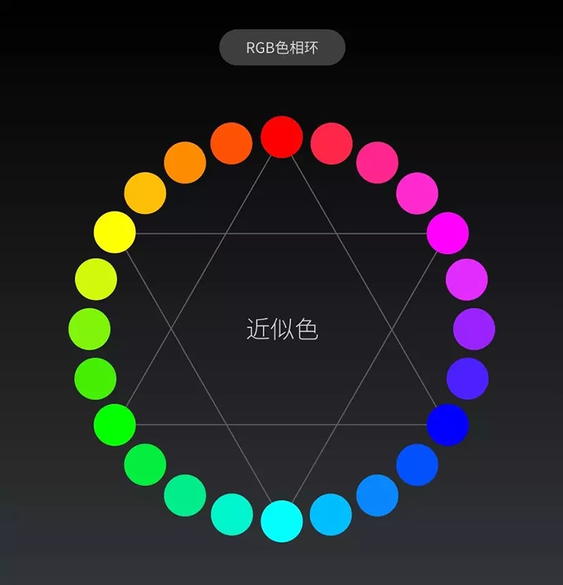 近似色就是在色相环上距离45度左右的色彩,也是较弱的色相对比,但效果要比同类色强,形成的配色效果也偏向和谐统一,如:红色与橙红或紫红相配,黄色与草绿色或橙黄色相配。