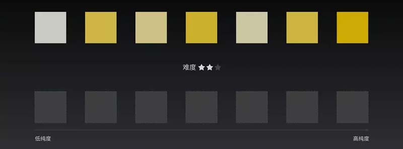 认识了五大色相的关系,就要开始色彩的纯度训练了,随意选择一个色相,然后列出该色相的不同纯度,随机打乱,然后填充到下方的色块中,这个训练的难度比较简单,按照纯度由低到高的顺序来挑选颜色,如果想训练复杂的纯度,可以考虑把三四个色相打乱排列,然后再来排序,难度大的多练习几次说不定色彩的感觉就训练出来了。