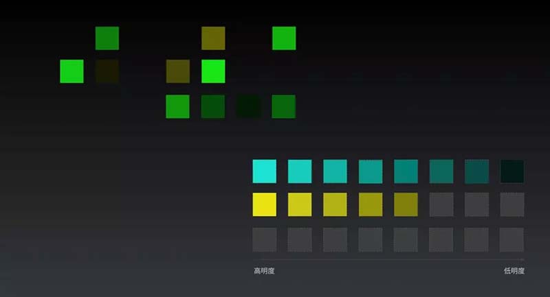 色彩的明度训练跟纯度类似,也有难以之分,按照色块的排列顺序摆放到下方正确的明度位置上,难度最高的,也就是多种颜色随机打乱,跟纯度训练是一样的道理,就不多讲了。