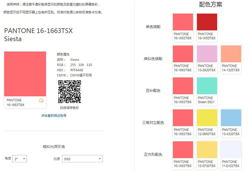 同理,Pantone色号PANTONE 16-1663TSX(Siesta)的配色方案如下