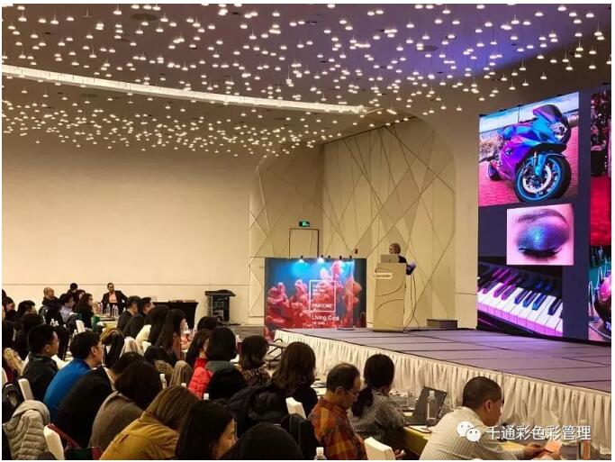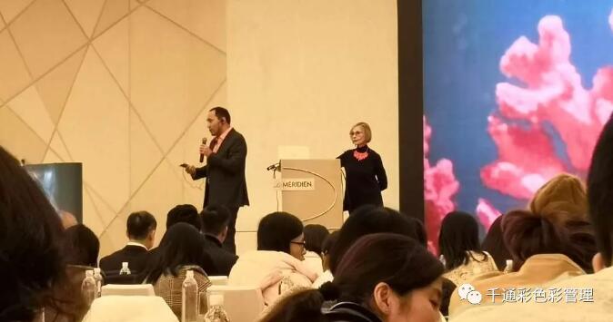 这次会议演讲嘉宾为彩通色彩研究所(Pantone Color Institute)行政总监Leatrice Eiseman女士以及彩通总经理兼爱色丽包装副总裁Adrián Fernández先生,当天两位嘉宾都将2019年度色“珊瑚橘”穿在了身上,非常亮眼且引人注目。