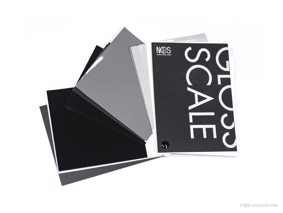 NCS光泽度标尺是一种解释和详细说明光泽度的工具,可以单独使用或者配合色彩一起使用。对于产品设计和环境设计的专业人士来说,它是一种有用的工具。根据NCS色彩空间里的亮度分布,NCS光泽标尺包括灰度尺里的四种颜色,分别是白色、浅灰色、中灰色和黑色。在每个颜色区域里面从全哑到高光共分为七个光泽级别。每个色样上面都有光泽级别名称、光泽值、NCS颜色编号以及近似亮度值等信息,便于彩色选择和比照。